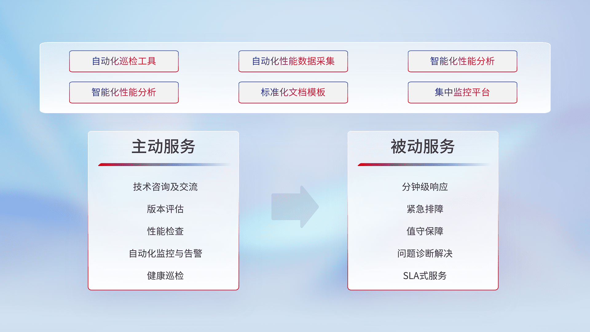 智能化工具和标准化文档,,,,保障服务质量,,,提供主动服务(包含技术咨询、、、版本评估、、、、性能检查、、、、自动化监控与告警、、、健康巡检)和被动服务包含(分钟级响应、、、、紧急排障、、值守保障、、、、问题诊断解决、、SLA服务)。。。