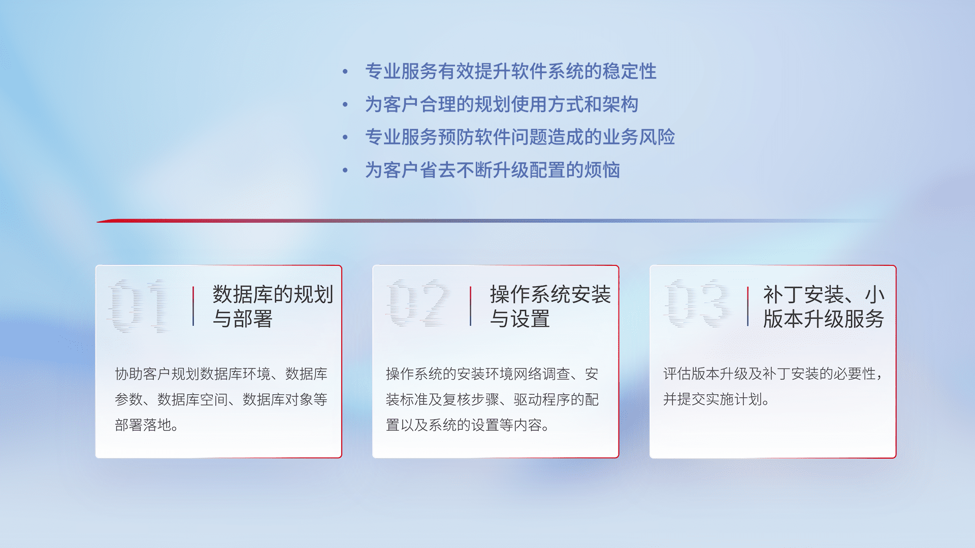 为客户提供软件规模升级、、快速部署、、、按需配置的专业服务,,从数据库的规划与部署到操作系统的安装与设置,,,再到补丁安装和小版本升级提供支持。。。。
